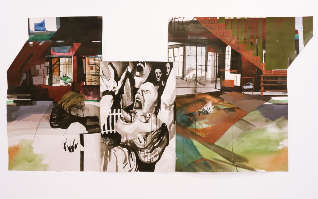 Crapulence (pages one, two, and three); 76” x 42”; acrylic, ink, and watercolor on paper; 2022