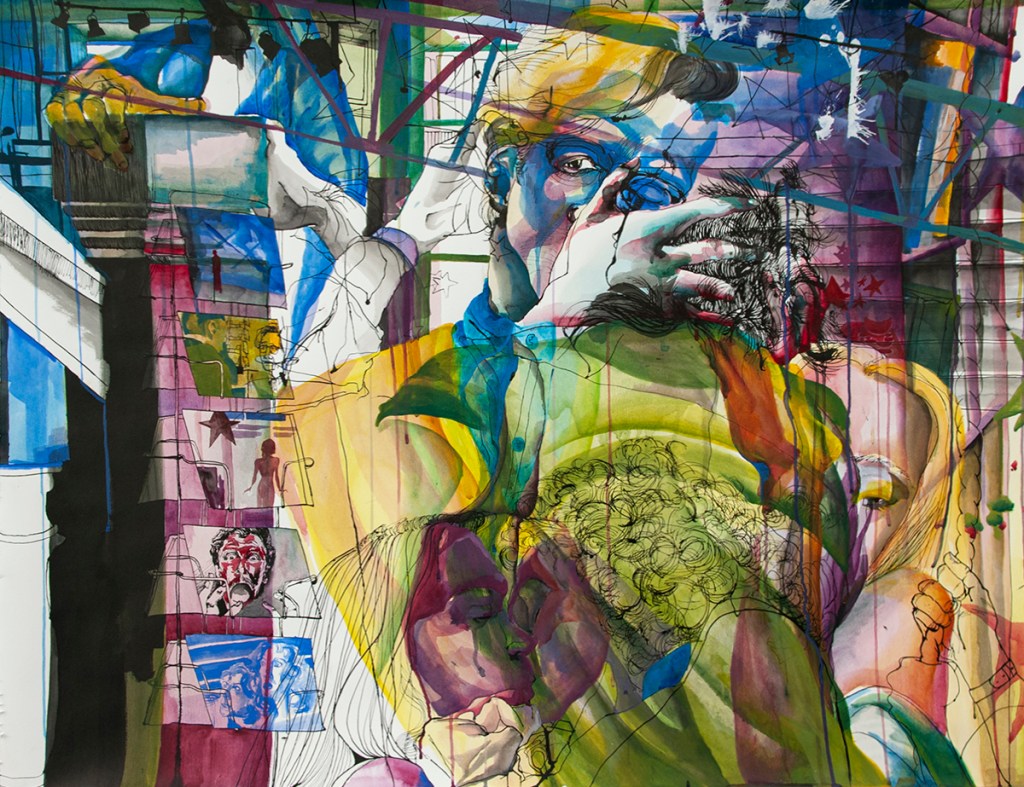 Acrylic, gouache, ink, and watercolor on paper; 47.5″x36″